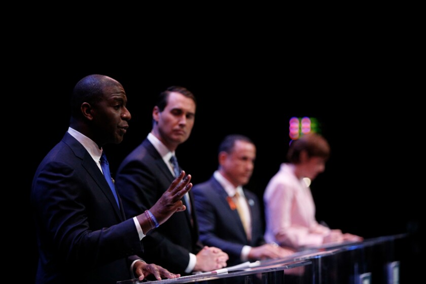 Tallahassee Mayor Andrew Gillum (far left) and his rivals in the Democratic primary argue that Democrats don’t just want an anti-Trump candidate, but also one who champions progressive ideals.